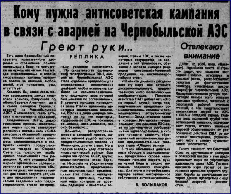 И все бы ничего, если бы не "слухи некоторых западных сми". ТАСС от 7 мая: "прямой угрозы здоровью жителей Киева и области нет", "западные агентства беду превратили в шантаж против СССР":